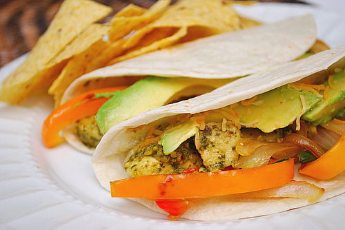 Season chicken with salt, pepper and garlic powder. In a skillet sprayed with cooking spray, saute chicken over medium high heat and cooked through. Toss cooked, seasoned chicken with the pesto. Fill tortillas with chicken and top with preferred garnishes.